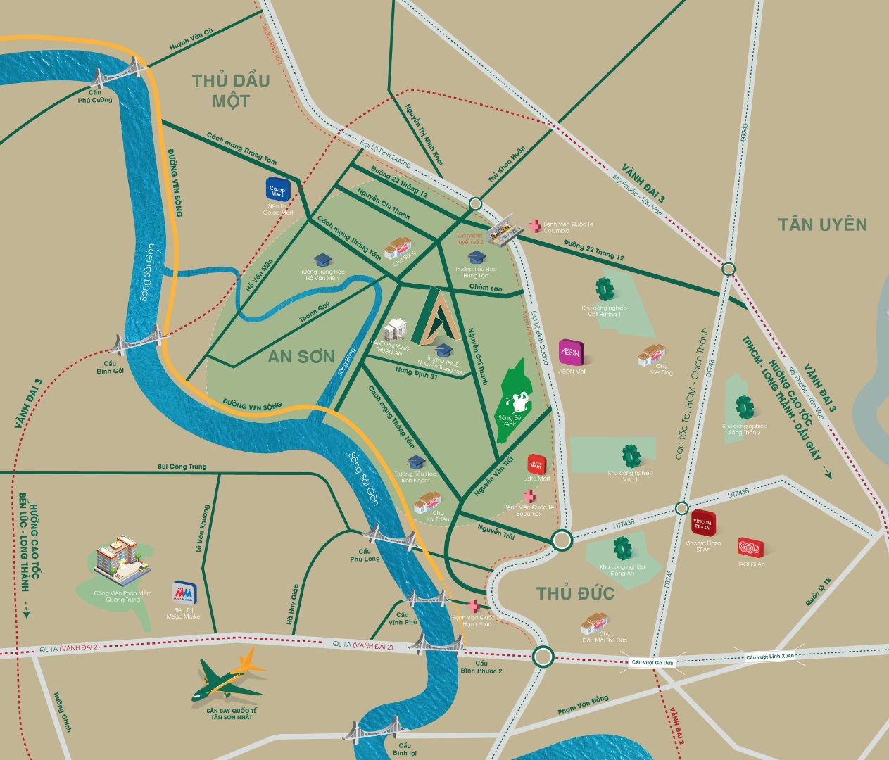 Đặc biệt, từ vị trí dự án chỉ mất vài phút để tiếp cận đến các khu công nghiệp quy mô như: KCN VSIP 1, KCN Việt Hương… Ngoài ra còn liền kề các TTTM Aeon mall, siêu thị Lotte Mart, Bệnh viện quốc tế Hạnh Phúc, Bệnh viện quốc tế Becamex…